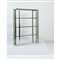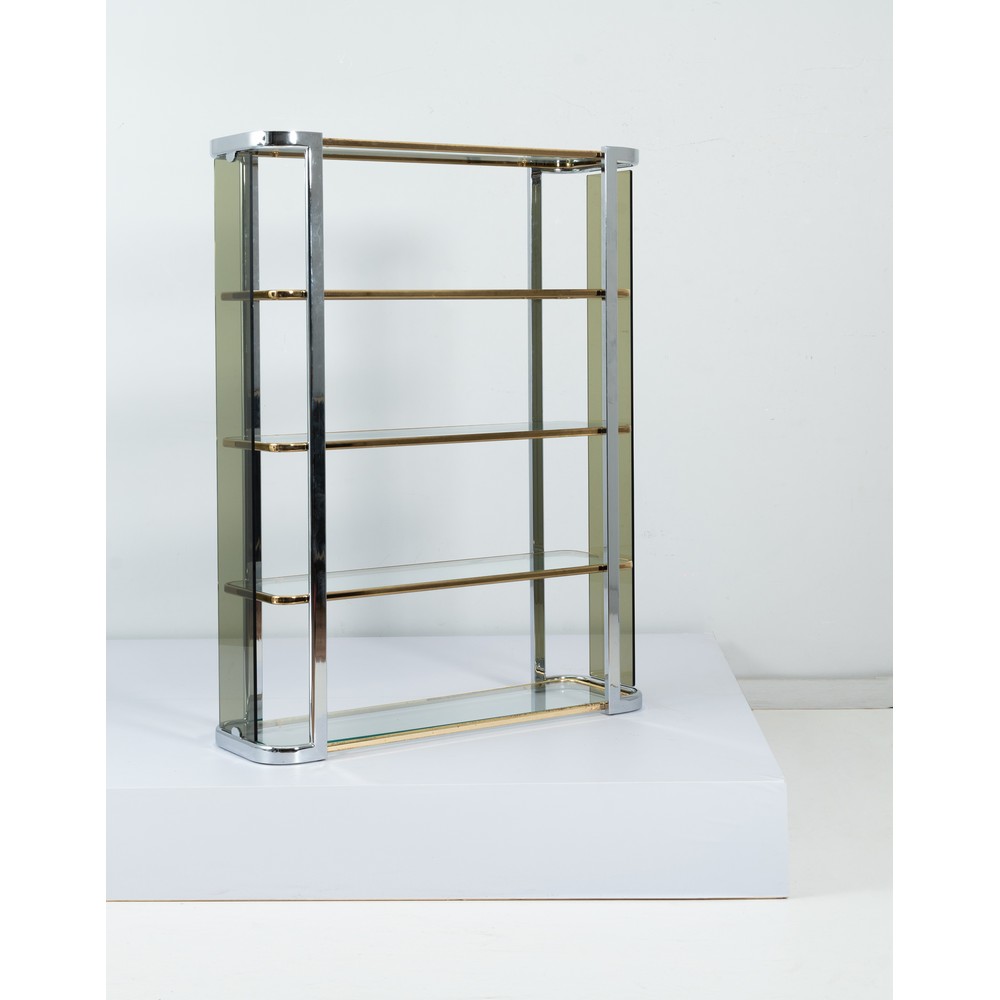 Etagere con struttura in alluminio cromato e dorato, fianchi curvati e chiusi con lastre di vetro fumè, tre piani intermedi in vetro trasparente.