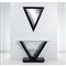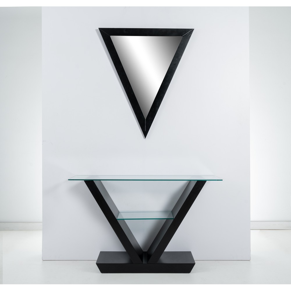 Consolle in legno laccato nero, corpo a “V” con piano e ripiano rettangolari in vetro trasparente. Uno specchio da parete triangolare con cornice in legno laccato nero e cristallo specchiato e molato.