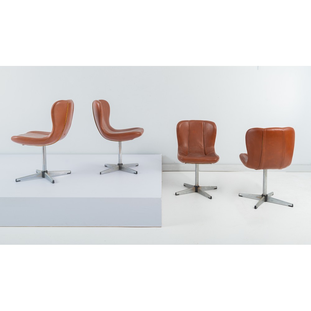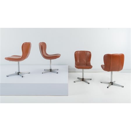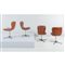 Quattro sedie girevoli con struttura in legno, sostegni in metallo cromato e rivestimento in pelle nei toni del marrone.