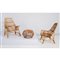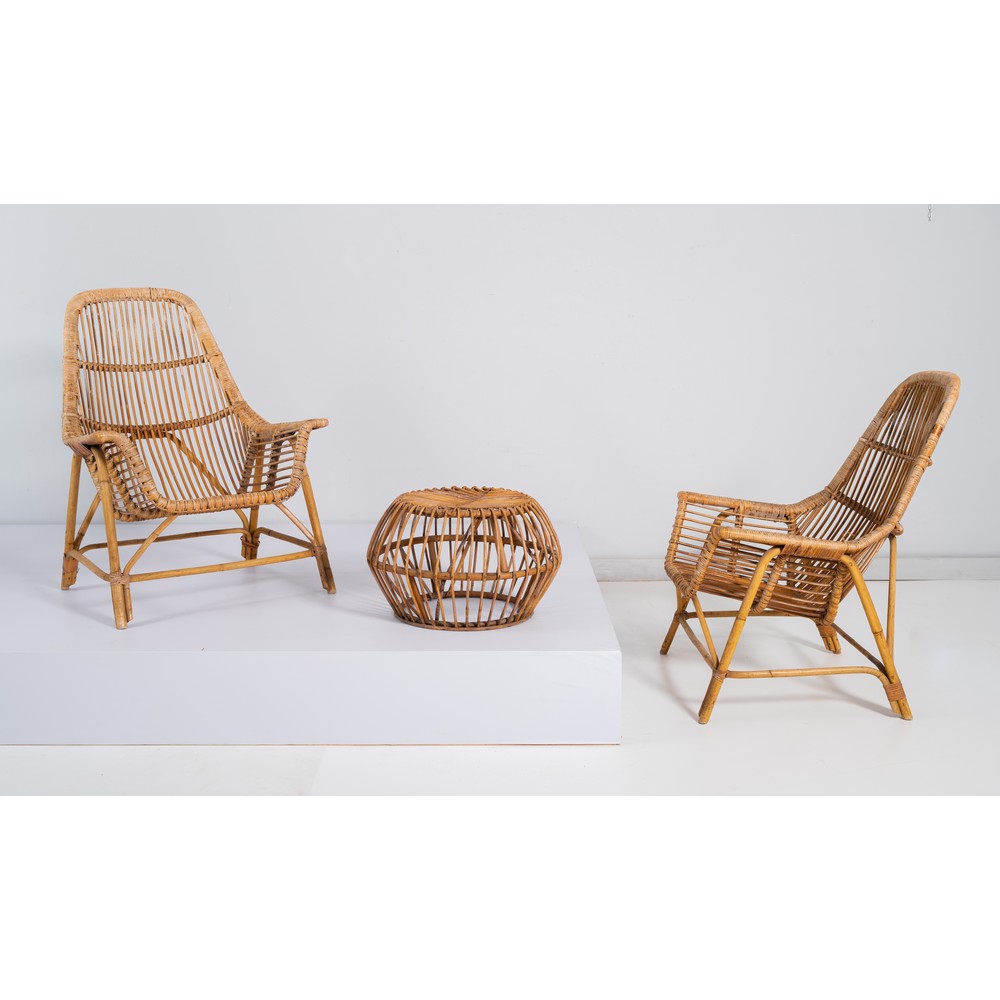 Coppia di poltrone con tavolo basso in malacca, giunco e canna d’india. Segni d’uso.