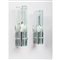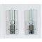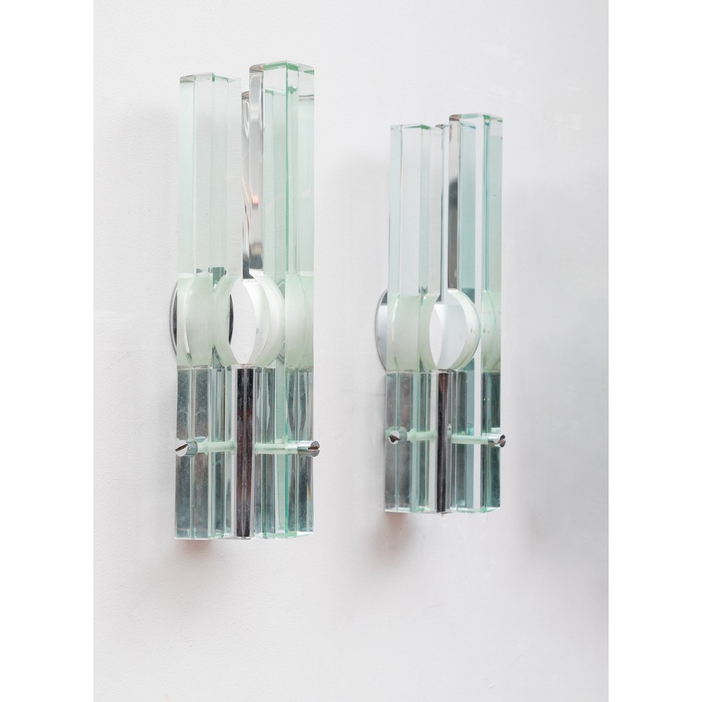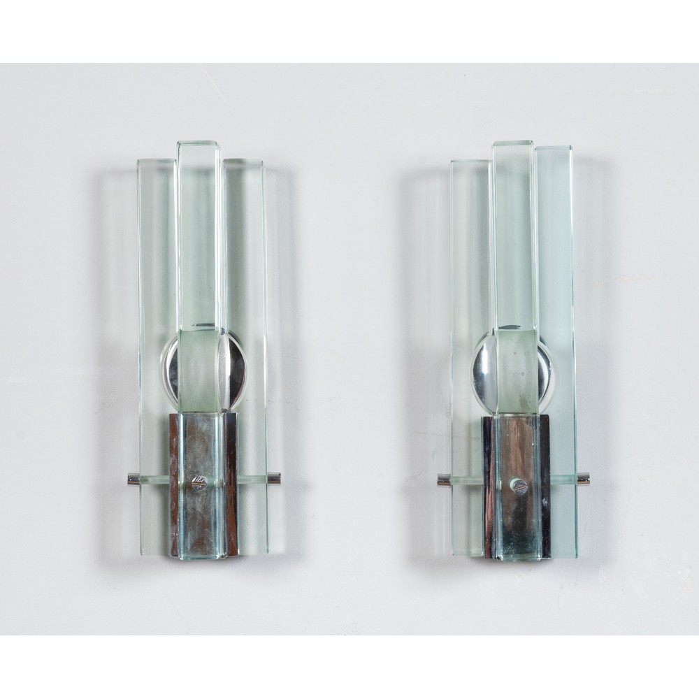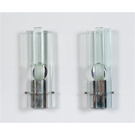Coppia di lampade da parete ad una luce, diffusore composto da lastre di cristallo molato trasparente di grosso spessore, struttura in metallo cromato.