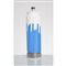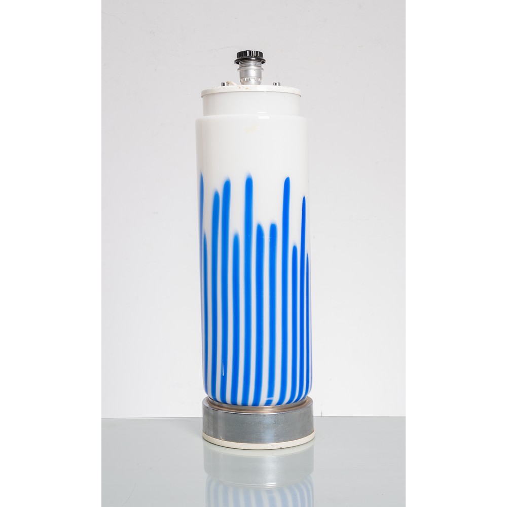 Lampada da tavolo ad una luce, struttura cilindrica in vetro lattimo e decorata con murine verticali blu, base circolare in metallo cromato, portalampada in metallo verniciato bianco.