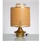 Lampada da tavolo ad una luce, base sagomata a vaso in ottone con due anse, diffusore conico in rattan intrecciato e bordato in metallo oro.