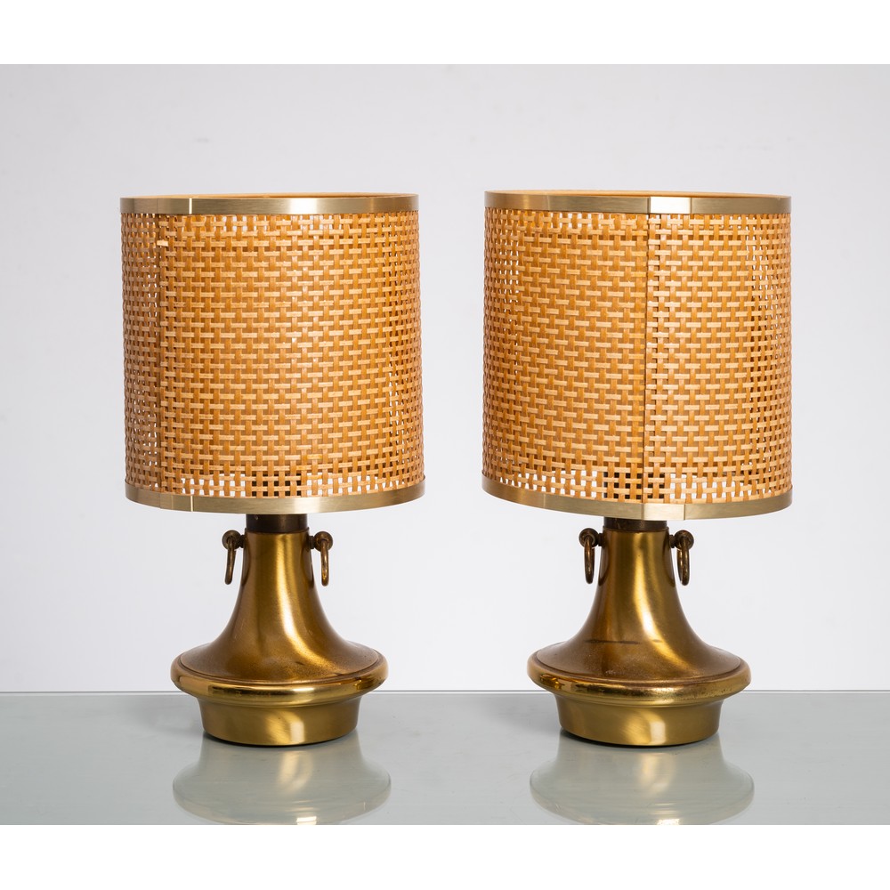 Coppia di lampade ad una luce, base sagomata a vaso in ottone con due anse, diffusore conico in rattan intrecciato e bordato in metallo oro.