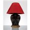 Lampada da tavolo ad una luce in ceramica nera con decoro policromo paisley, base circolare in metallo dorato, paralume in tessuto plissè nei toni del rosso. Marchio di produzione.