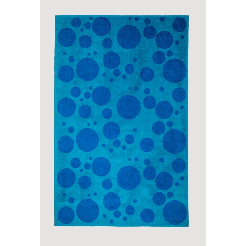 Tappeto rettangolare a fondo blu decorato con sfere di diversa circonferenza nei toni più scuri.