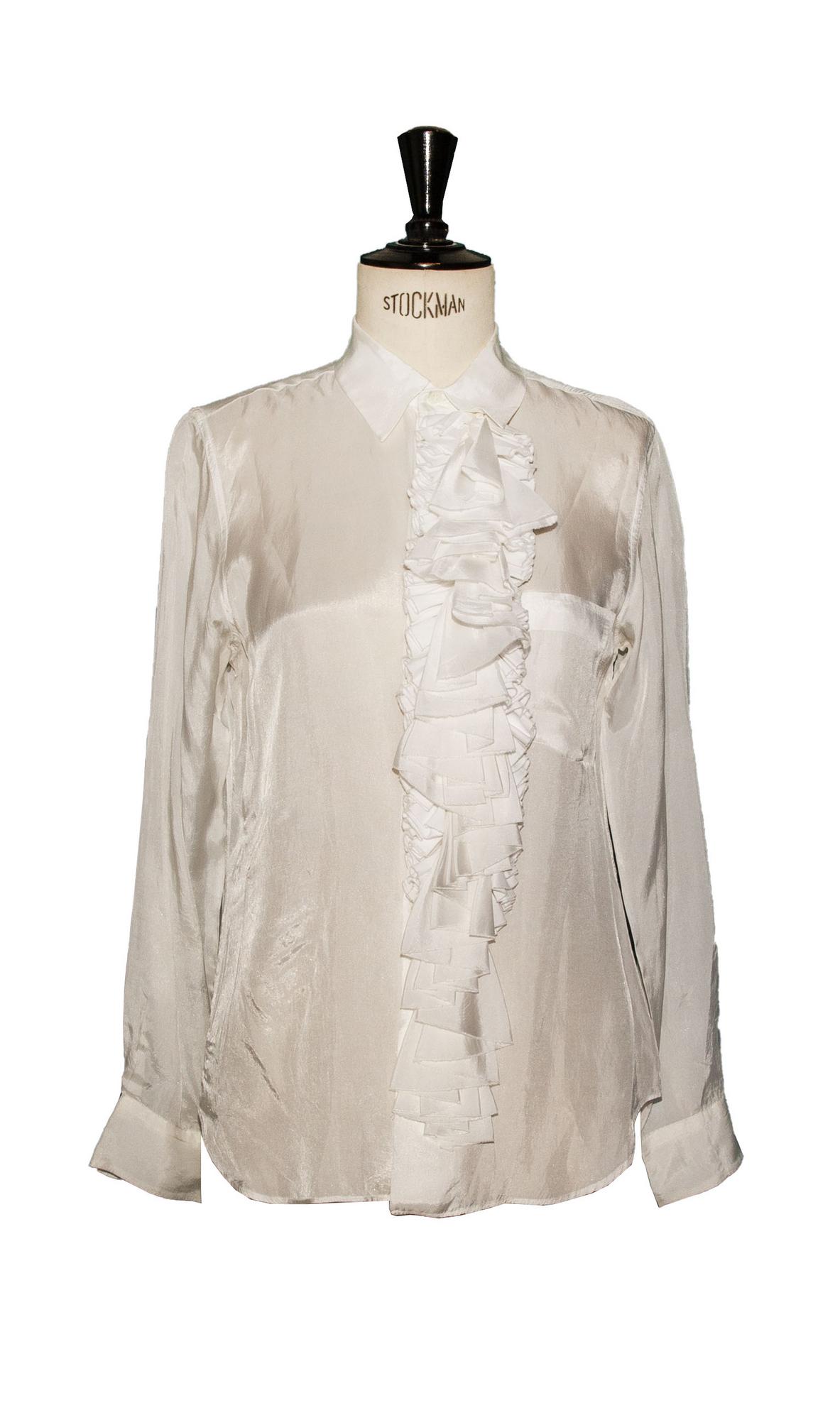 Shirt in White Viscose fabric with rich jabot in the front. Made in Japan IT SIZE 44. Never worn. Eccellent condition.