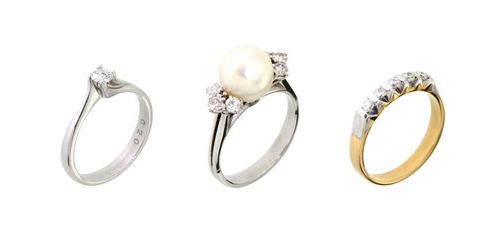 Lotto composto da tre anelli: uno in oro bianco con al centro diamante solitario di ct 0,22 ca; il secondo in oro bianco con perla centrale del diam di mm 9,6 con ai lati sei diamanti taglio brillante per complessivi ct 0,35 ca; il terzo, fedina in oro giallo e bianco con cinque diamanti taglio brillante per complessivi ct 0,28 ca