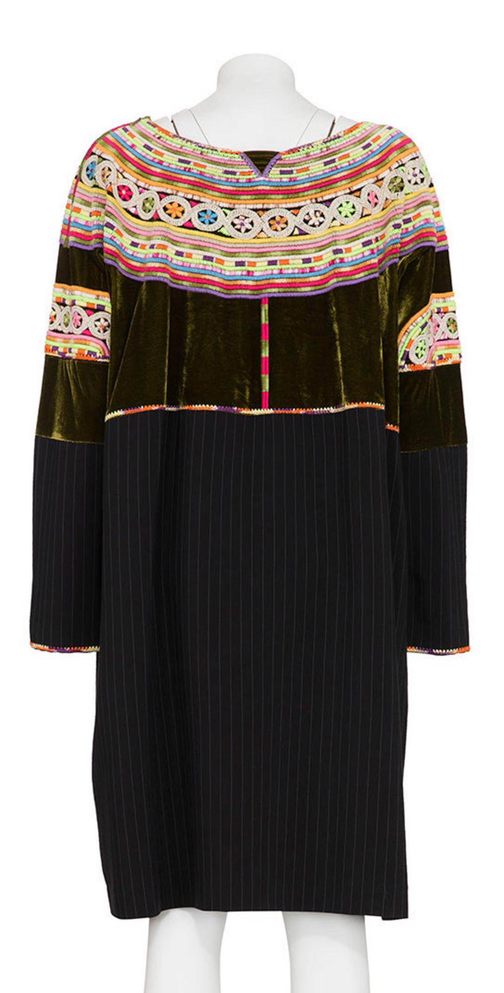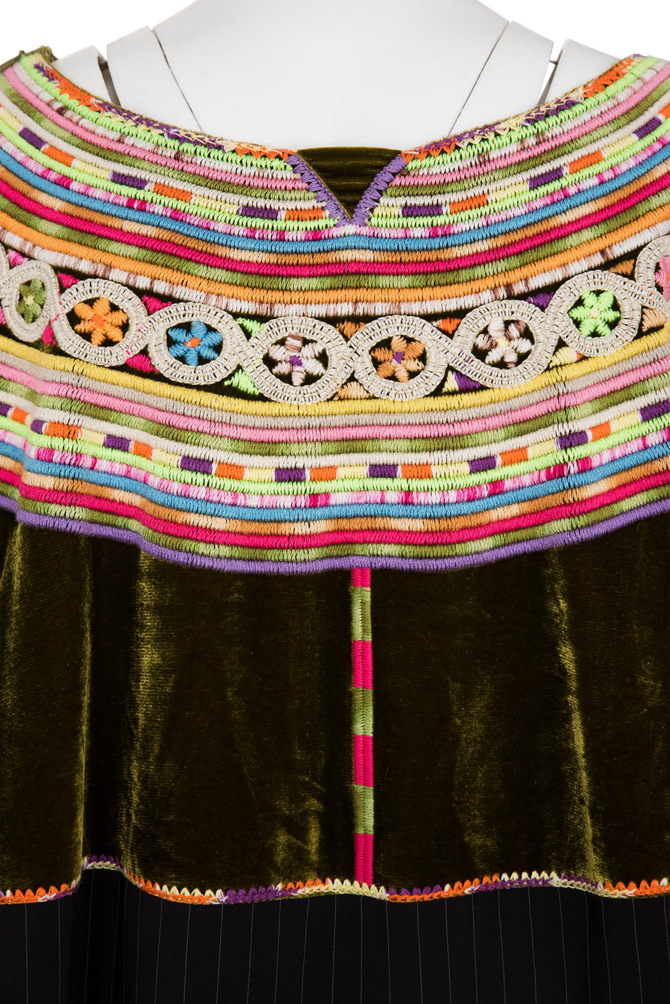 Tunic with multicolor embroidery and green velvet top from FW 10 collection. Black pinstripe wool at bottom. No composition tag, seems to be wool. Size IT 46. Excellent conditions, never worn with tag.
