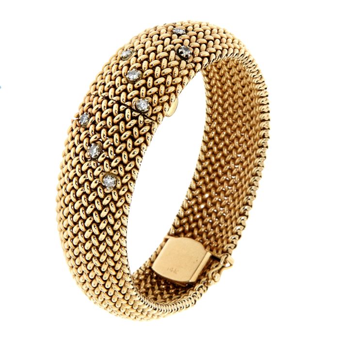 Cassa in oro giallo 14 Kt , integrata, a scomparsa, in bracciale a cordonetti in rilievo con diamanti taglio brillante per complessivi ct 0,30 ca;