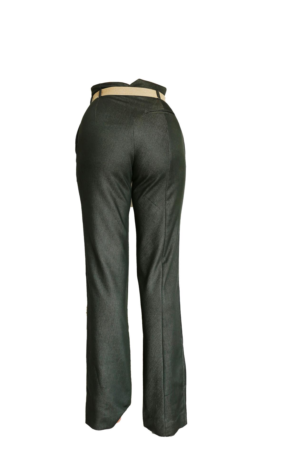 High-waisted trousers in forest green wool gabardine with elastic cord belt and pockets. Made in England. UK size 10. Well preserved.