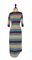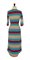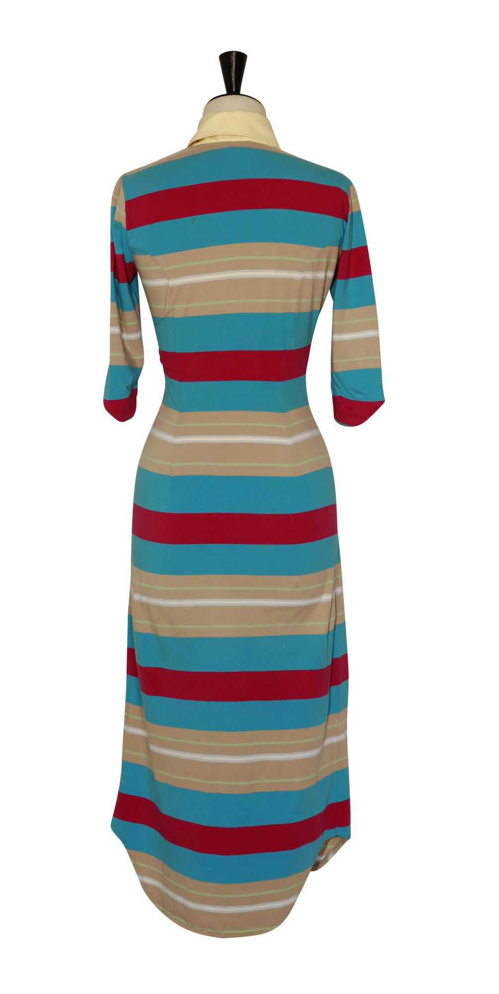 Abito lungo in jersey di cotone stretch a righe multicolore e colletto polo alto in piquet di cotone, logo orb ricamato sul petto. Dalla collezione Cafe' Society primavera estate 1994. Taglia M. Made in Italy. Perfettamente conservato.