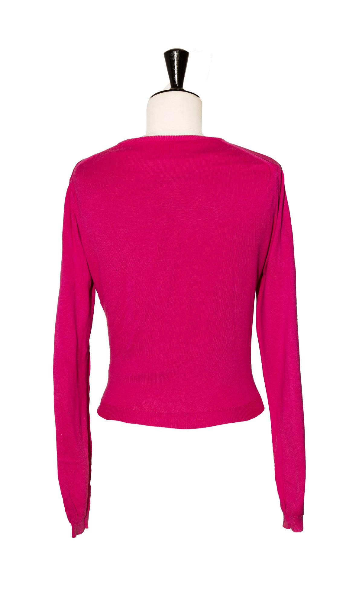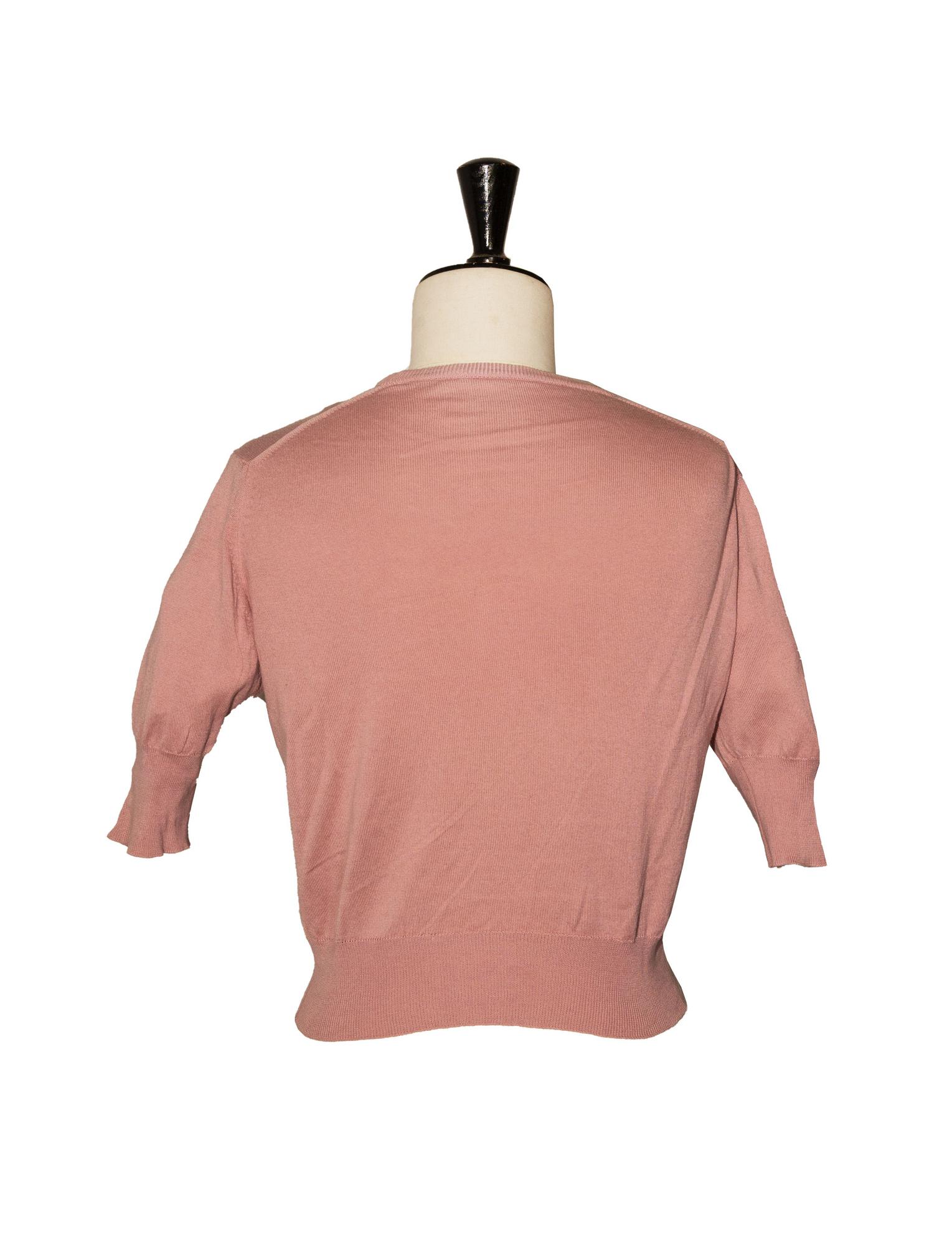 Cotton twin set of two different types in pink. A crew neck with short sleeves and a bow and a cardigan with fastening only at the neck and at the bottom of the garment. Made in Italy in the 90s. Size M. Perfectly preserved.