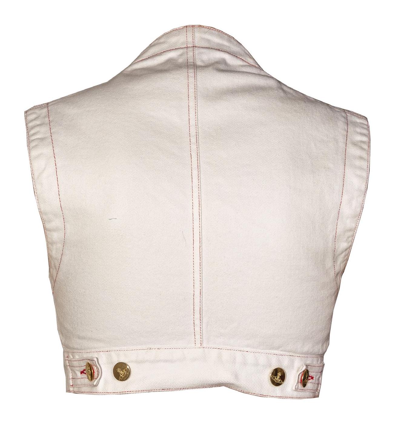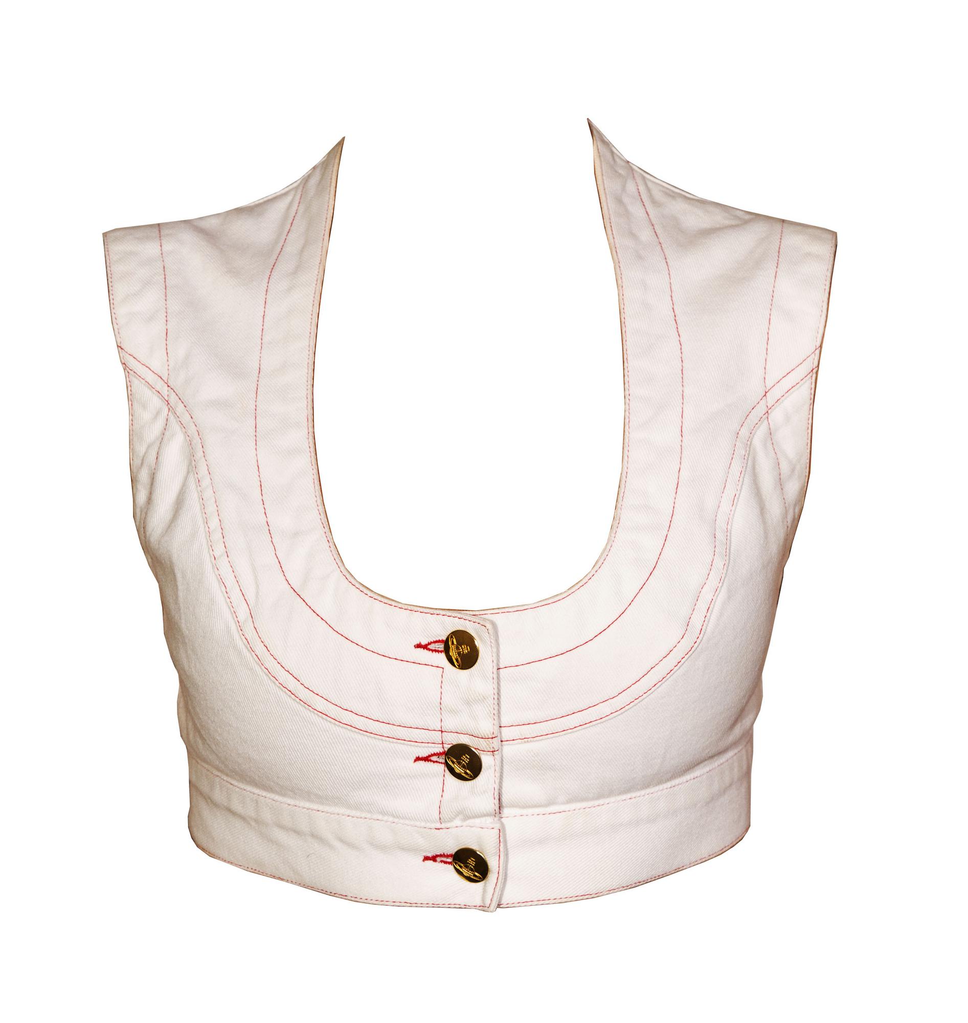 Unlined bodice in white cotton drill with red stitching, wide neckline and studs buttons with orb logo. Size IT 42, Made in Italy. From the early 90s. Perfectly preserved.
