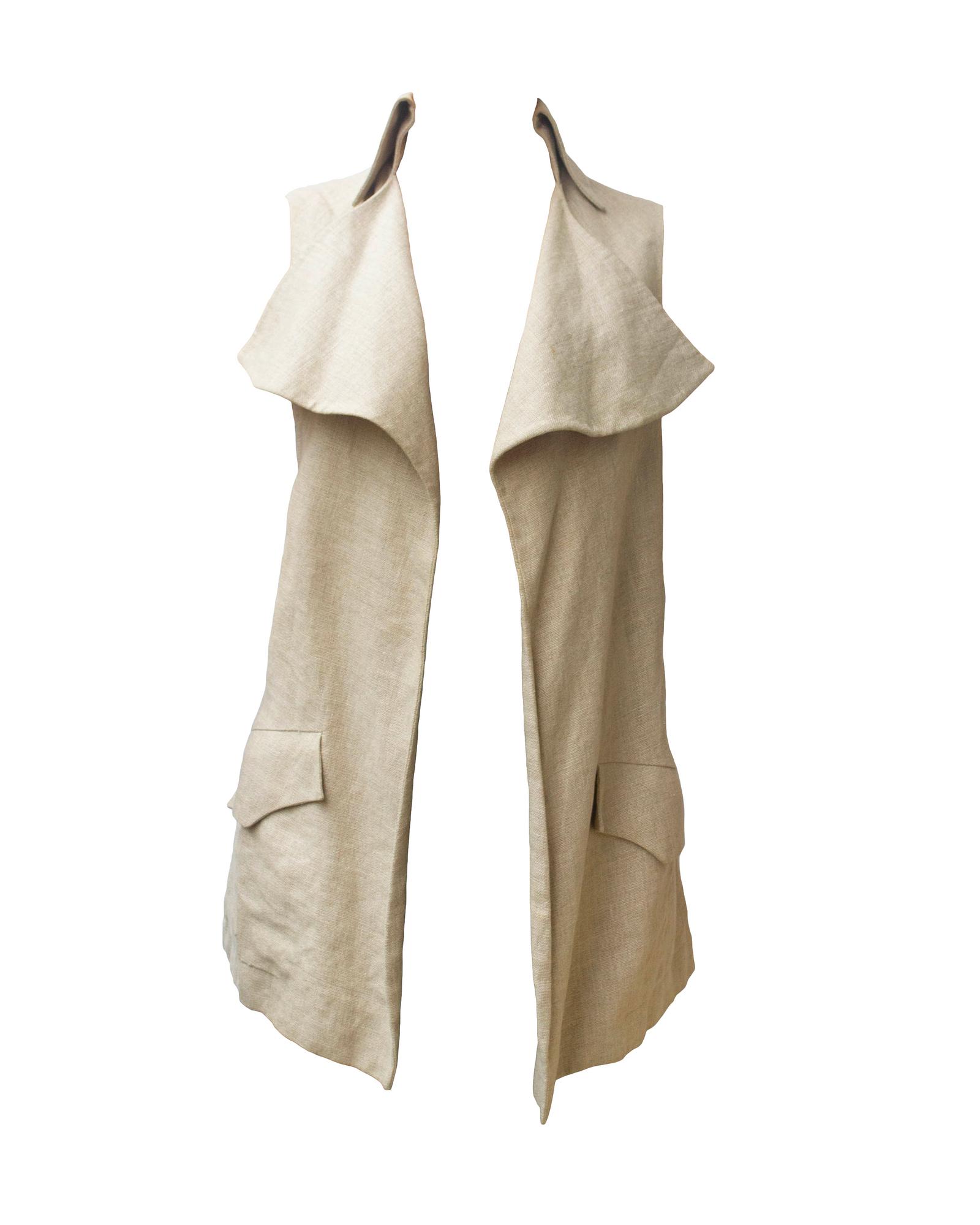 Long semi-lined waistcoat made of natural color linen, pockets and wide collar with reverse. Slit in the center back. It is worn unfastened and open. Made in Italy in the 90s. Size 42. Perfectly preserved.
