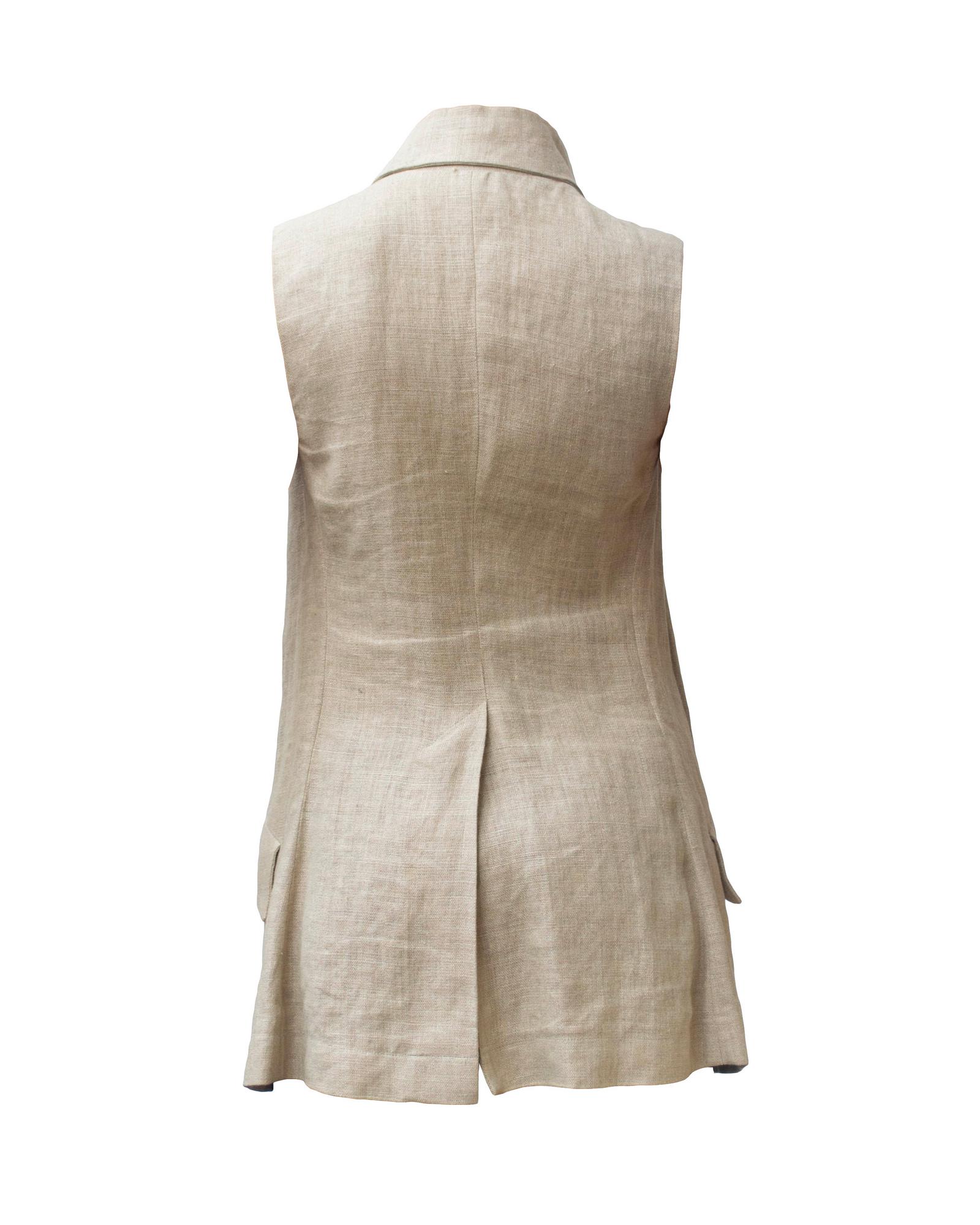 Gilet lungo semi foderato realizzato in lino colore naturale tasche e ampio collo con reverse. Spacco nel centro dietro. Si porta slacciato e aperto. Made in Italy negli anni '90. Taglia 42. Perfettamente conservato.