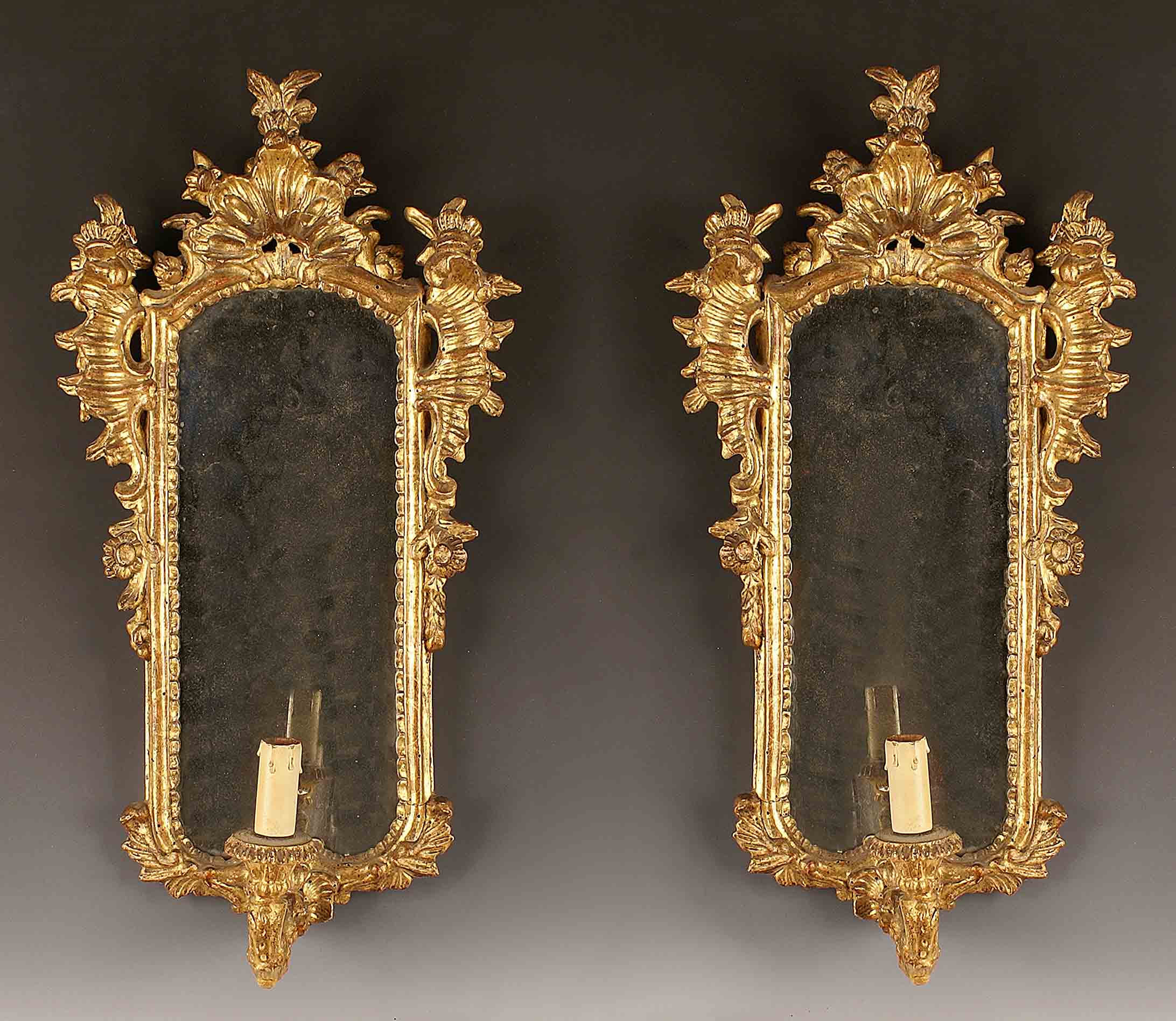 Coppia di specchierine di forma rettangolare con appliques a due luci in legno dorato ed intagliato a motivo floreale e di volute, Italia, fine del XVIII secolo, cm. 63x35 (difetti).