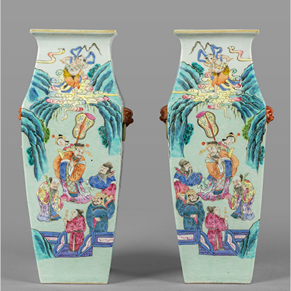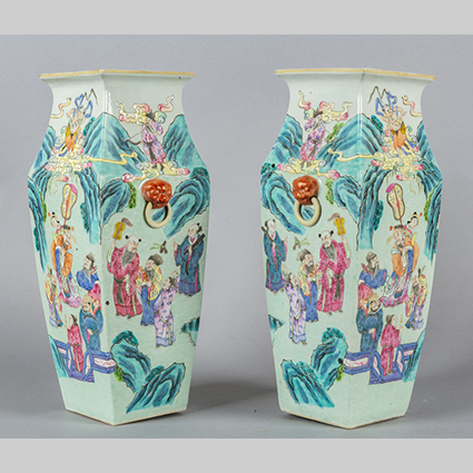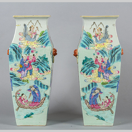 Coppia di vasi di forma quadrata in porcellana decorati in policromia con scene di vita cinese fine sec.XIX