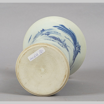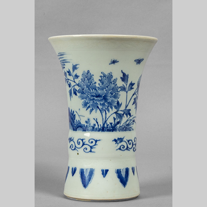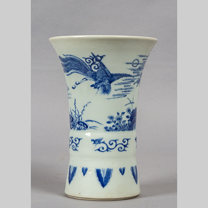 Vaso a tromba in porcellana bianca e blu decorato con motivi floreali e fenice dinastia Ming (1368-1644)