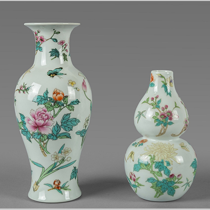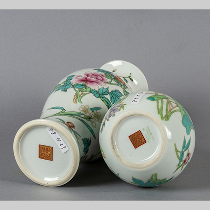 Due vasi in porcellana di Cina di forme diverse decorati a fiori marcati sul fondo in oro