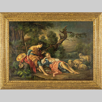 'Scena galante' olio cornice in legno intagliato e dorato inizi sec.XX