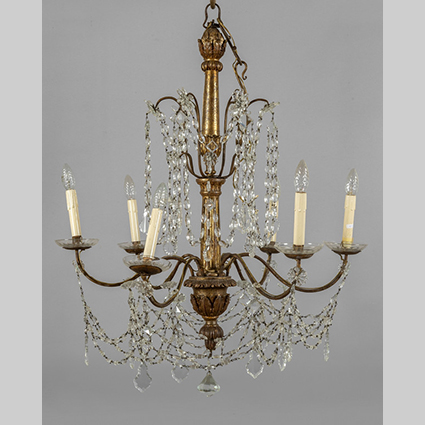 Lampadario Luigi XVI a sei luci con fusto in legno intagliato e dorato Genova fine sec.XVIII