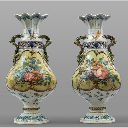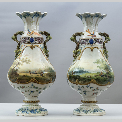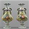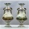 Coppia di vasi in ceramica decorati in policromia con fiori e paesaggi uno reca nel collo marchio coronato con scritta GBV Nove