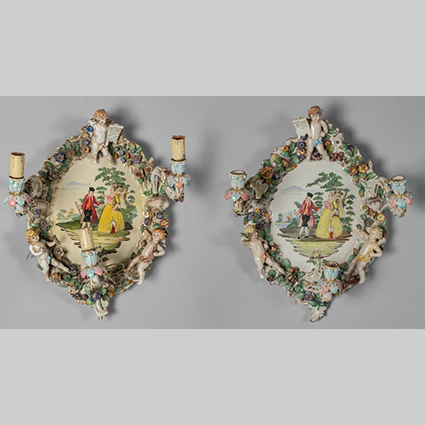 Coppia di apliques in maiolica a quattro braccetti decorate in policromia con angioletti inizi sec.XX