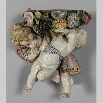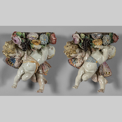 Coppia di mensole formate da due angioletti che sorreggono un cestino di frutta e fiori Italia Meridionale inizi sec.XX