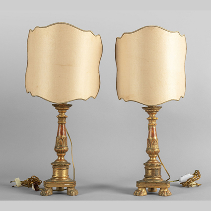 Coppia di candelieri in legno intagliato e dorato montati a lampada sec.XVIII