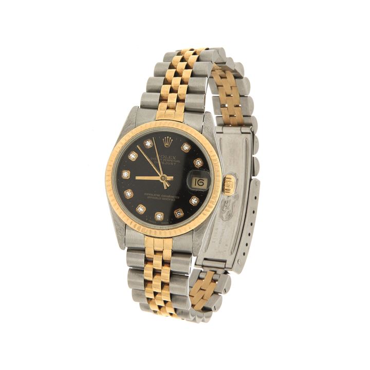 Cassa oyster in acciaio e oro giallo con fondo e corona a vite; bracciale oyster acciaio ed oro; quadrante con indici in brillanti (parzialmente rovinato)