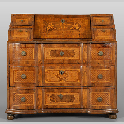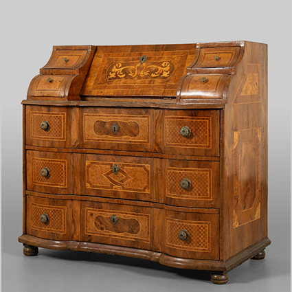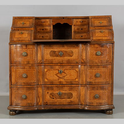 Ribalta Luigi XIV lastronata in legni vari ed intarsiata in radica di tuja Altoveneto I metà sec.XVIII
