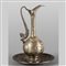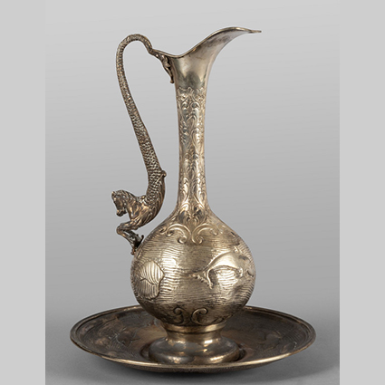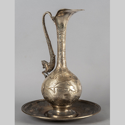 Brocca con piatto in argento sbalzato decorato con pesci