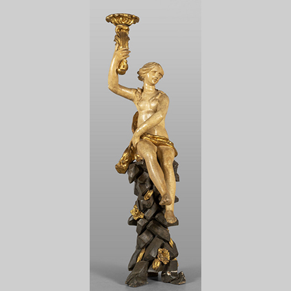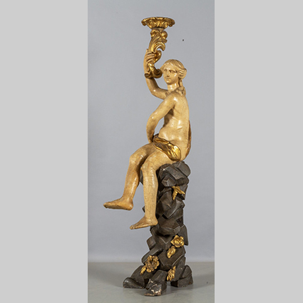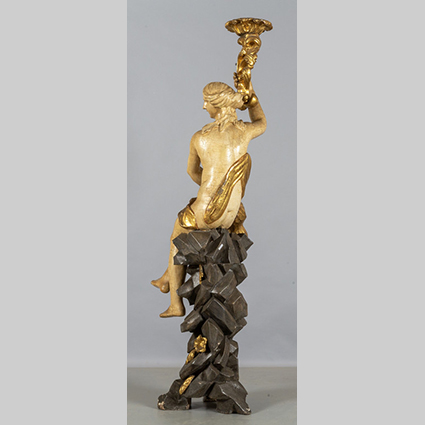 Torcera in legno intagliato dorato e laccato raffigurante giovane donna che sorregge un braccio porta luce Genova sec.XVIII