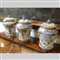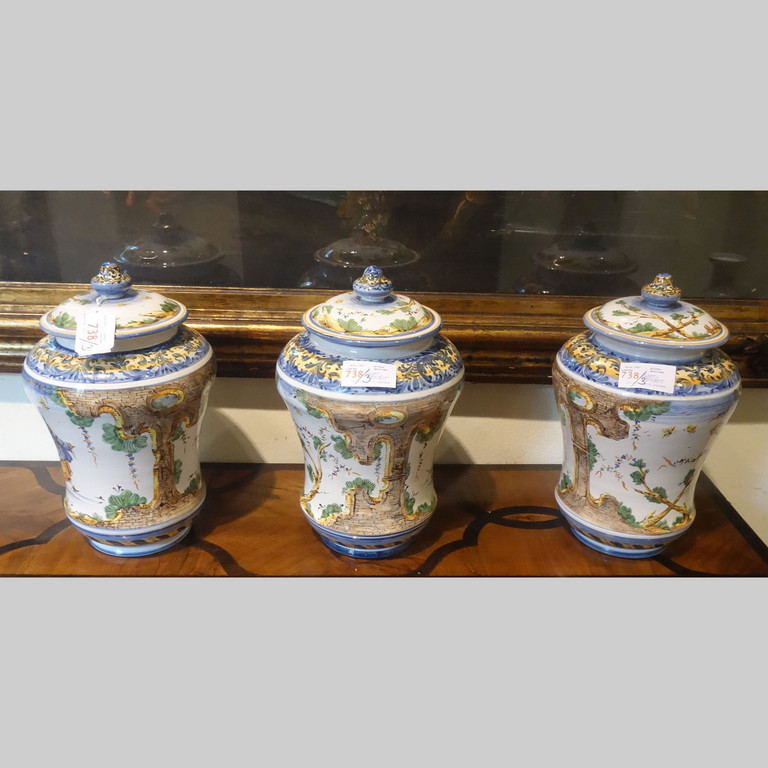 Tre grandi albarelli in ceramica decorati in policromia a rovinismo su fondo bianco f.ti nel fondo Gaggero Albissola sec.XIX