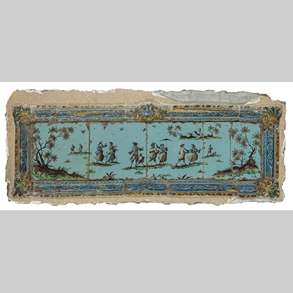 Pannello in maiolica formato da quattro formelle decorate a figure in un paesaggio Savona sec.XIX