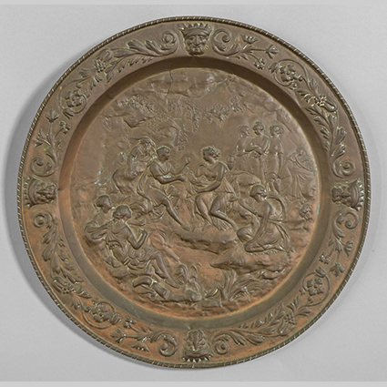 Grande piatto da parata in metallo sbalzato con scena neoclassica fine sec.XIX (diam.cm.63) e mensola in metallo con piano in vetro