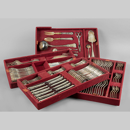 Servizio di posate in argento per 12 incompleto composto da: 24 forchette grandi e 12 coltelli grandi 12 forchette da ostriche 12 cucchiai grandi e 12 da dolce 12 forchette da pesce con 12 coltelli e 8 posate da portata