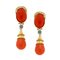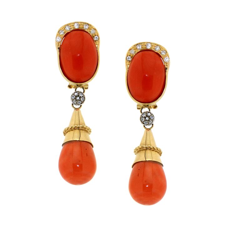 Coppia di orecchini in oro giallo con ovali cabochon e gocce di corallo giapponese; diamanti taglio brillante e 8/8 per complessivi ct 0,75 ca