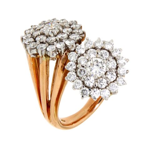 Anello in oro rosa, modello contrarié, corpo traforato, sommità a forma di fiore con diamanti taglio brillante per complessivi ct 2,80 ca