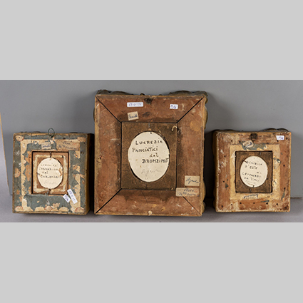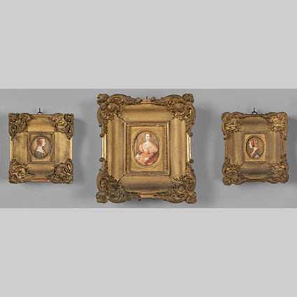 Tre miniature ovali raffiguranti donne famose da dipinti del Ghirlandaio di Leonardo da Vinci e del Bronzino cornici in gesso dorato sec.XIX