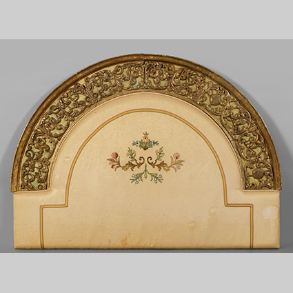 Testata da letto a mezzaluna in legno intagliato dorato e laccato parte centrale imbottita con ricami