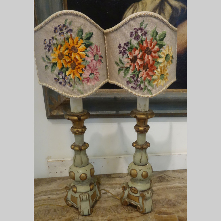 Coppia di candelieri in legno intagliato e dorato adattati a lampada