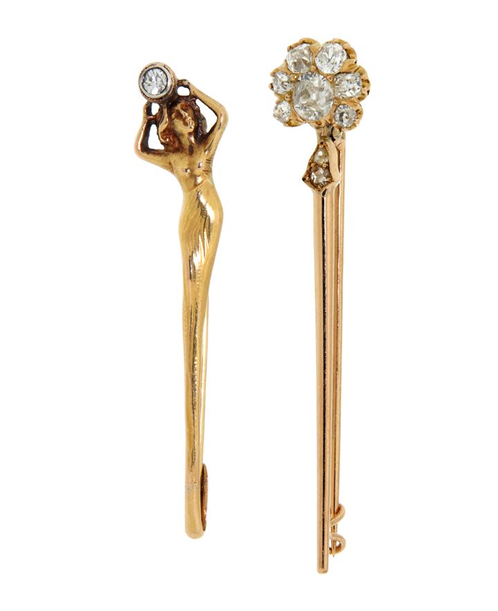 Lotto composto da due spilla in oro giallo: una a forma di fiore, l'altra a forma di donna con diamanti taglio brillante di vecchio taglio per complessivi ct 1,0 ca