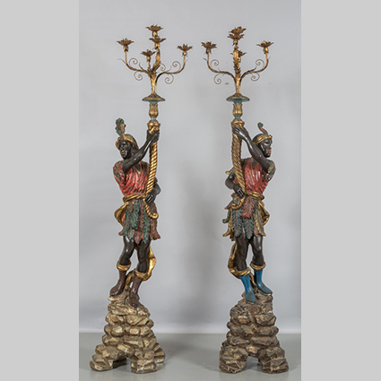 Coppia di moretti reggitorciera in legno intagliato laccato e dorato inizi sec.XX