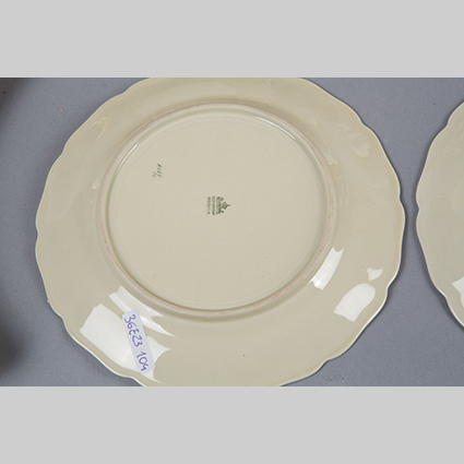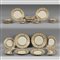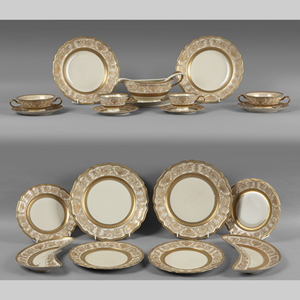 Servizio di piatti in porcellana Rosenthal 'Regina' decorata in oro su fondo beige composto da: 36 piatti piani 12 fondi 12 da formaggio e 12 da dolce 13 mezzelune 12 tazze da brodo con piattino 12 tazze da thè con piattino