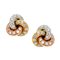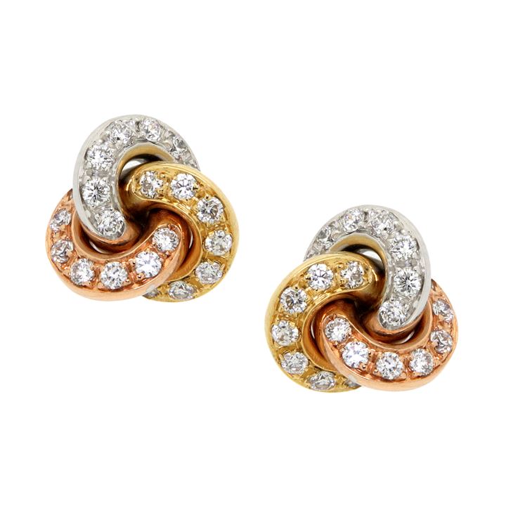 Coppia di orecchini nei tre colori dell’oro, a forma di nodo, diamanti taglio brillante per complessivi ct 0,55 ca
