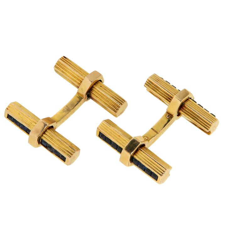Coppia di gemelli in oro giallo, a barretta, con zaffiri carrè lungo i lati