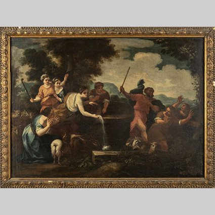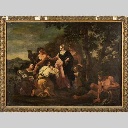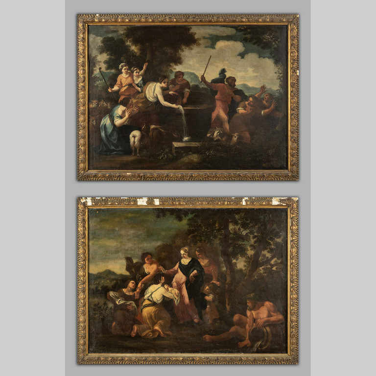 Scuola piemontese sec.XVIII 'Rebecca al pozzo' e 'Mosè salvato dallle acque' coppia di olii