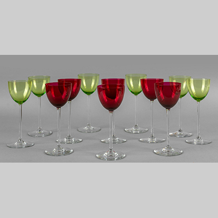 Dodici bicchieri (sei + sei) in cristallo Baccarat verdi e rossi